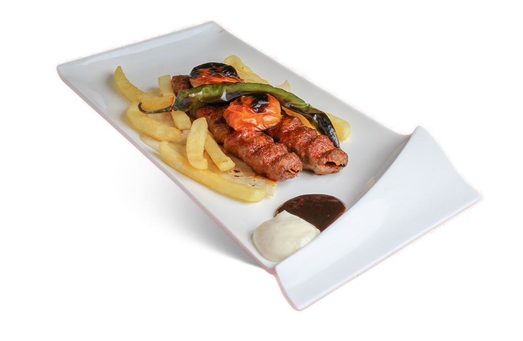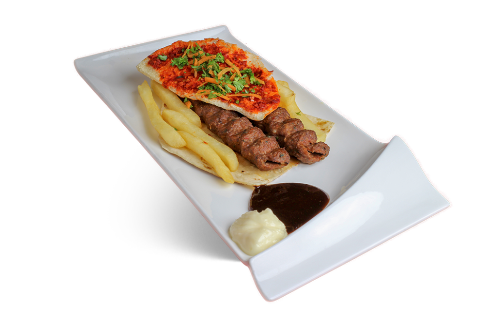 Two skewers lamb kebab in spicy tomato sauce served with fries, garlic sauce & bread
