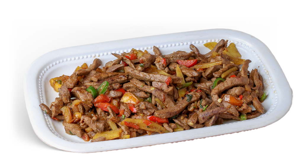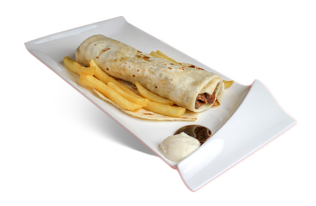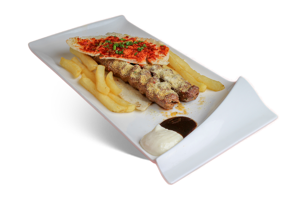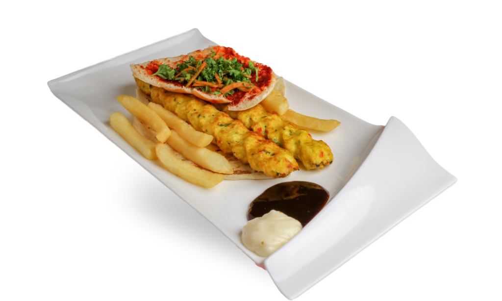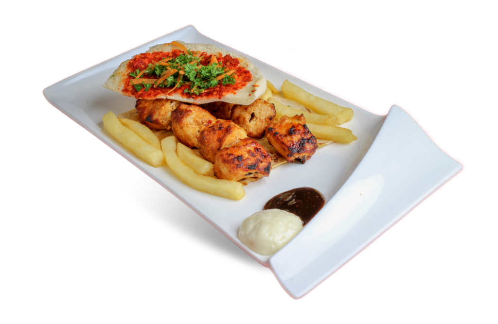 Two skewers beef cubes marinated with spices served with fries, garlic sauce & bread