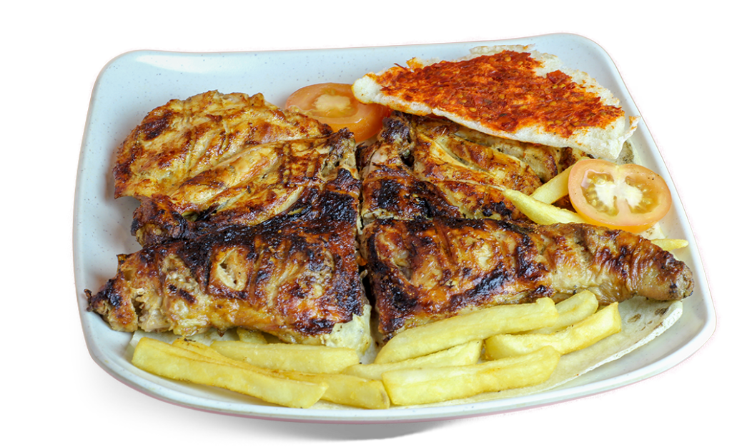 Whole spring chicken grilled on firewood served with fries, garlic sauce & bread